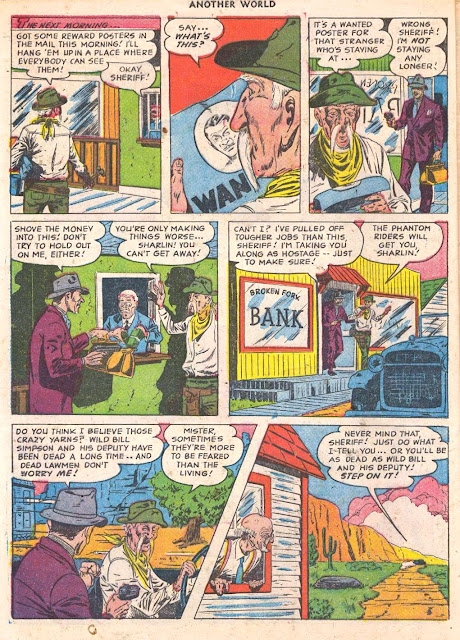 The standout is "Monsters of the Mind", Written by Bill Woolfolk, who scripted for Capt. Marvel and Superman it is the story of a man who is entrusted with a briefcase of government defense secrets. He suffers a head injury when hit by a car and afterwards imagines (?) aliens are after him and the secrets. The strip was drawn by Bob McCarty (aka Bob McCarthy) who worked for the Simon and Kirby studio and Atlas/Marvel, among others. McCarty also drew some horror comics for Toby Press.